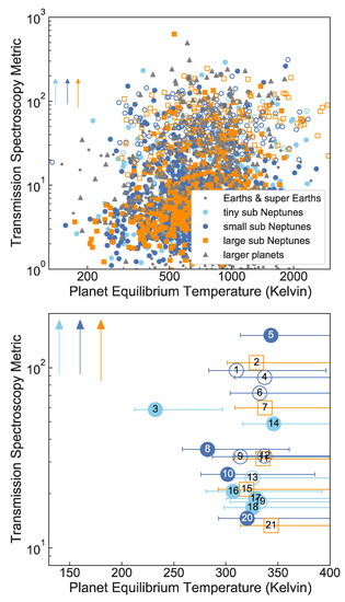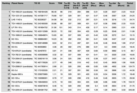 - Kempton, E.M.; Bean, J.L.; Louie, D.R.; Deming, D.; Koll, D.D.B.; Mansfield, M.; Christiansen, J.L.; López-Morales, M.; Swain, M.R.; Zellem, R.T.; et al. A framework for prioritizing the TESS planetary candidates most amenable to atmospheric characterization. Publ. Astron. Soc. Pac. 2018, 130. [Google Scholar] [CrossRef]