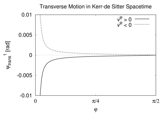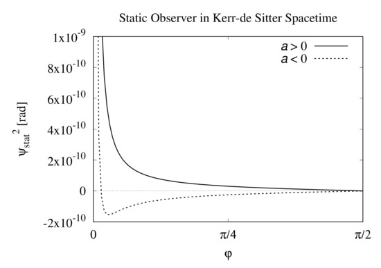 The general relativistic aberration equation was employed to incorporate the effect of the motion of the observer on the measurable angle . To obtain the measurable angle , the equation of the light trajectory was obtained in such a way that the background is de Sitter spacetime instead of Minkowski spacetime. At the end of Section 3.1, we mentioned that the choice of the zeroth-order solution is important; a zeroth-order solution in Kerr–de Sitter and Schwarzschild–de Sitter spacetimes should be chosen in such a way that the background is de Sitter spacetime, Equation (18). Further, Equation (20) or at least Equation (21) should be used as the trajectory equation of the light ray.