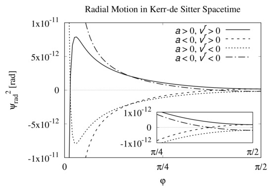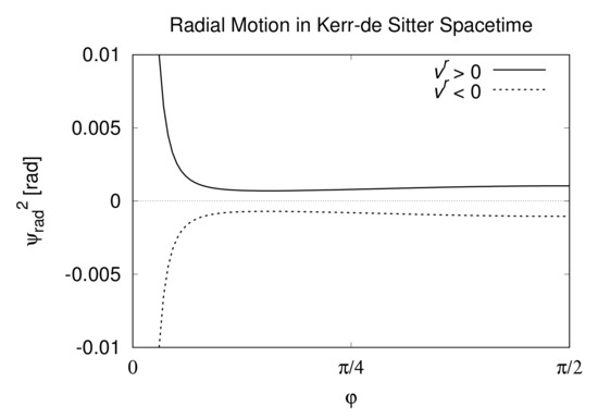 in which is the radial coordinate value of the light ray at the point of closest approach (in our case ), and can be obtained by the observation in principle as the circumference radius . It is also possible to obtain a similar relation from Equations (12) and (13); but the expression becomes more complicated. Equation (25) means that unlike the Schwarzschild–de Sitter case, B cannot be expressed only by , m, and a; and b too are required. As a result, the trajectory equation of the light ray in Kerr–de Sitter spacetime depends on the cosmological constant and b; whereas the equation of the light trajectory in Schwarzschild–de Sitter spacetime is independent of and b; in fact setting in Equation (25) yields