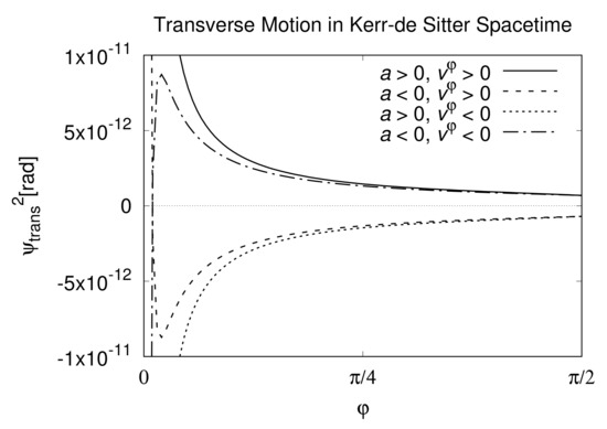 Figure 6 and Figure 7 show the dependences of Equations (48) and (49), respectively. Equation (48) consists of terms; however, unlike Equation (45), for the positive transverse velocity , Equation (48) diverges to negative infinity when approaches 0 and vice versa. When , Equation (48) converges to 0 regardless of the sign of the transverse velocity . From Figure 7, we find that regardless of the sign of the spin parameter a, Equation (49) becomes positive infinity for the positive transverse velocity and negative infinity for the negative transverse velocity when approaches 0. When , Equation (49) converges to which depends on both the spin parameter a and the transverse velocity unlike Equation (46). As in Equation (46), the magnitude of Equation (49) is at most and it is two orders of magnitude of smaller than the second order contribution in Equation (41).