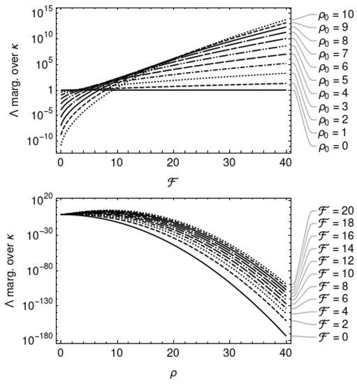 The likelihood ratio marginalised over (Equation (19)). Top: as a function of for fixed values of . Bottom: as a function of for fixed values of .