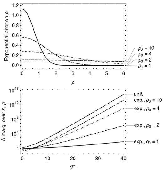 Even if the parameterisation of the likelihood ratio in terms of , , and does not prove a fruitful route to obtaining an analytic expression for the -statistic, it could nevertheless provide a useful method of incorporating the -statistic into a Bayesian framework. The marginalised likelihood ratios presented in Section 3 are readily computed, as they are a function only of the -statistic and well-known special functions. These are able to harness the computational efficiency of existing implementations of the -statistic, while permitting an assumption of a prior on that is more physically reasonable than the prior implicit in the -statistic, which is biased toward stronger signals [36]. More physically reasonable priors on than the examples explored here, such as the Fermi–Dirac prior of [57], could be amenable to analytic marginalisation through this approach.