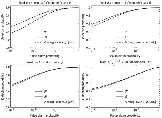 Figure 6 shows receiver–operator curves for the four signal populations listed above. The curves for the -statistic and -statistic reproduce Figures 2 and 3 of [36]. The curves for overlay the corresponding curves for , confirming that has identical detection power to the -statistic. Receiver–operator curves for , and were computed, for various choices of and , respectively, and were found to be identical to the curve for .