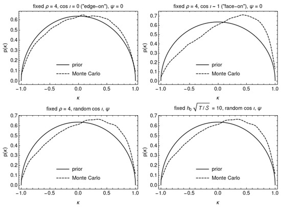 Figure 7 compares the distribution of computed from the Monte-Carlo samples using Equation (11) with the assumed prior of Equation (18). The Monte-Carlo distribution is a good fit to the prior for , and a poor fit for ; for the two signal populations where was randomly drawn, the fit is intermediate between the two extremes. This suggests that the initial choice of prior on , which assumed no preferred orientation between the vectors and , is biased in favour of linearly polarised signals. This is consistent with being of equivalent detection power to the -statistic, which, as noted in [36], is also biased in favour of linearly polarised signals.