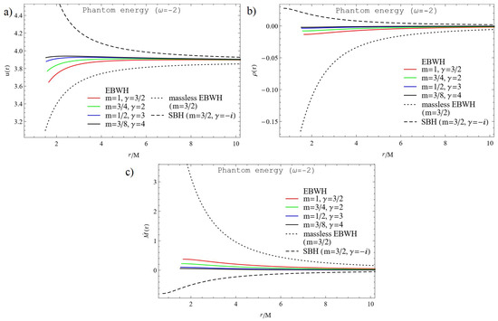 Figure 1c represents the rate of change of mass against the radial coordinate . As we can see, the accretion of phantom energy decreases the mass of SBH, since as a result of , , in perfect accordance with the conclusion in [27], but increases the mass of EBWH since as a result of . We can see from Figure 1c that the property is shared also by the Wheelerian mass of massless EBWH.