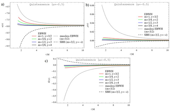 Velocity profile (a), energy density (b) of quintessence matter () and rate of change of mass (c) of EBWH versus for different values of and m, which satisfies . For illustration, we used set of constants , and .