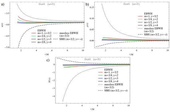 Velocity profile (a), energy density (b) of dust () and rate of change of mass (c) of EBWH versus for different values of and m, which satisfies . For illustration we used the set of constants , , and .