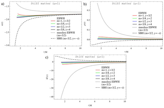 For quintessence (Figure 2), dust (Figure 3), and stiff matter (Figure 4), Figure 2a, Figure 3a and Figure 4a show that massless EBWH has the highest velocity of accreting fluid, and the SBH profile shows lowest velocity profiles. In the case of massive EBWH, the increase in induces a decrease in velocity of the accreting fluid. Accreting matter reaches its highest values near the central source but far away from it, all the three profiles tend to bunch together.