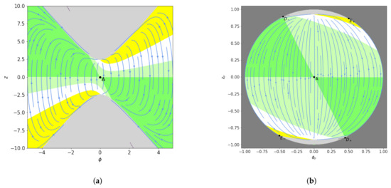 These points correspond to the locations where the boundary of the physical phase space (44) runs into the asymptotic circle representing infinity. Checking with (43), the effective barotropic index at these points is indeed given by (37), i.e., by at and by at . As these points reside at the boundary of the physical phase space, they correspond to the utmost kinetic regime of the scalar field, either rolling “down” or “up” its potential. For small , the points act as stable nodes where the trajectories originate, but for large , they are saddles. The points are always saddles. In the limit of minimal coupling, , the points and merge with , giving it a hybrid saddle-node character, as seen in Figure 1b.