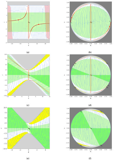 Again by construction, the factor cancels out from the dynamical system (56). In addition, due to the symmetry of the model, the system is symmetric under the reflection , and the phase space exhibits a “diagonal” symmetry on Figure 3.