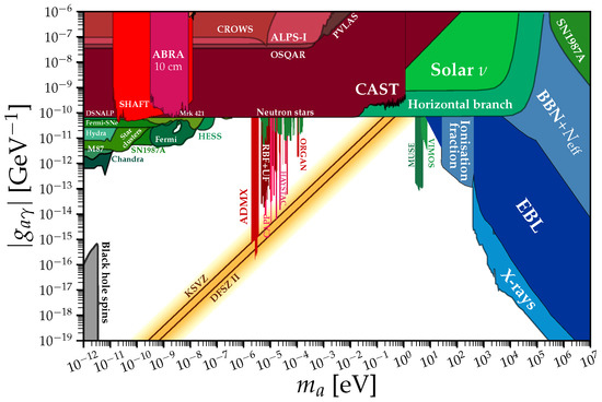 At present, after many unsuccessful searches for axions (see Figure 1 for a collection of limits), the axion model was extended to a wider group of particles, called Axion-Like Particles (ALPs), in which the decay constant is no longer coupled with the axion mass, in contrast with the original axion (Equation (2)) [11]. ALPs are also often found in SM extensions, motivated by string theory.
