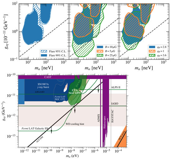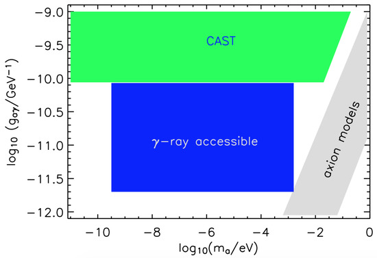 where B is the magnetic field component aligned with the photon polarization vector and s is the size of the magnetic field domain. If the photon–axion conversion happens at the source, the product in Equation (12) is directly connected to the Hillas criterion [67] for the maximum possible acceleration energy of cosmic rays, and taking into account that cosmic rays with energies up to a few times eV have been observed, it follows that sources with should exist [37]. Hooper and Serpico [37] showed that IACTs such as H.E.S.S., MAGIC and VERITAS could have probed the range of masses of eV with sensitivities stronger than CAST, as shown in Figure 4. The best candidates for observation were identified with AGNs located in the cores of galaxy clusters. One can now compare Figure 4 with Figure 1 to see how Hooper and Serpico [37] were right in their predictions.