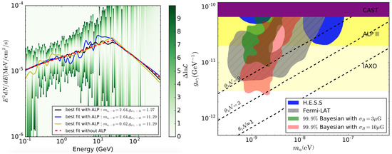 where is the residual of the middle bin in the triplet, the measured flux, the flux in the median bin expected from the power-law fit to the side bins, covariance matrix for the triplet and . Although both methods showed consistent results, Abramowski et al. [39] evaluated that, due to its independence of the global spectral model assumption, the sum of residuals over three adjacent spectral bins is preferred for this kind of analysis. This estimator is calculated for each set of ALPs parameters and 1000 spectra are simulated in order to take the randomness of both the intergalactic magnetic field and the galaxy cluster magnetic field into account. The distribution of values of the spectral irregularity estimator for both the observed spectrum and spectra folded with photon–ALP oscillations for different ALPs parameters are compared, and exclusions of the ALPs parameter space were obtained at 95% confidence level. The results (Figure 5, right) yielded constraints on the photon–ALP coupling value for masses of the ALPs in the range (15–60) neV [39].