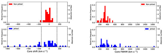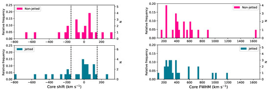 First of all, we examined the properties of the [O III] lines separately in jetted and non-jetted sources, as indicated in the second to last column of Table 4. We first compared the velocity of the core component of [O III] with respect to the galaxy rest frame in the two samples. We remark that, by definition, a source is considered a red or blue outlier when the velocity of the line core component is km s, following the definition by Komossa et al. [38]. The distributions are shown in the left panel of Figure 3. Among our 28 non-jetted sources, we found only one blue outlier (∼4%) and no red outliers. In our sample of 48 jetted sources, instead, we found 15 blue outliers (∼31%) and 3 red outliers (∼6%).