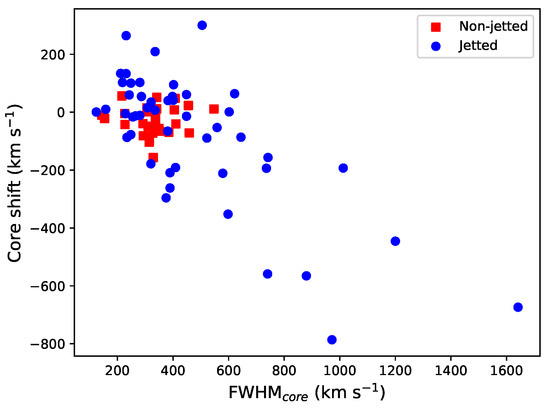 We also studied whether a correlation is present among the core shift and the FWHM of the [O III] core component. The result is shown in Figure 4, while the values we obtained are reported in Table 6. The Pearson correlation coefficient for all sources is , and its p-value, that is the probability that this result is due to a random distribution of sources, is 8 × . However, as we have seen before, a core shift is present almost exclusively in jetted sources. Therefore, we decided to test the two samples separately. In non-jetted sources, no correlation is present (, p-value = 0.93), indicating that the FWHM of the [O III] core and its position are independent of each other. Conversely, in jetted sources the Pearson correlation coefficient is higher (), and the p-value is , indicating that the correlation is present only in this sample of objects. It is worth noting that this correlation is utterly dominated by the presence of the blue outliers. Indeed, when the Pearson coefficient is evaluated in this sample rejecting the blue outliers, its value becomes (p-value = 0.13). Vice versa, when only the blue outliers are tested, the correlation remains, although with a lower p-value (r = , p-value = ). In conclusion, [O III] core velocity and FWHM do not seem to correlate in the bulk of NLS1s population, but they are related among blue outliers.