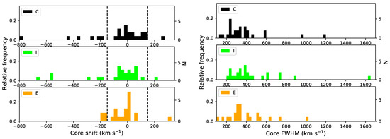 The property we are most interested in is the shift of the whole [O III] line, that is, the blue outlier phenomenon. Our aim is to have a better understanding of what may be causing this shift. We tested the core velocity against four physical properties that may be associated with it, that is the actual [O III] line luminosity, the bolometric luminosity, the radio luminosity, and the radio loudness parameter. The first two, indeed, have been found to possibly affect the [O III] core shift especially at high redshift [68]. The radio luminosity and the radio loudness parameter, instead, may be related with the presence of relativistic jets (with some caveats, see e.g., [69,70]). The results of these tests are reported in Table 3. None of the tested quantities is strongly correlated to the velocity of the [O III] core. This is true also when the absolute value of the shift is considered, neglecting whether the line is blueshifted or redshifted. An example is shown in Figure 2. Since it is known that [O III] shift can also be radiatively driven in high luminosity sources [68], and a weak, but significant correlation is identified by the Spearman’s rank correlation coefficient between L and |v|, we wanted to investigate whether an L threshold exists above which a source has a higher possibility of showing an [O III] shift or a higher FWHM([O III]). As seen in the left panel of Figure 2, however, no clear threshold seems to be present to produce an [O III] shift. In the FWHM distribution, the highest values of FWHM are found mostly, but not exclusively, among the highest luminosity sources, although the statistic is too poor to draw any meaningful conclusion.
