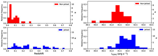 We tried also to verify whether the distribution of [O III] luminosity is different among the jetted and non-jetted sources. Indeed, since jetted sources are located at higher redshift, there could be a selection bias toward more luminous sources. The two distributions are shown in the right panel of Figure 7, and they are actually different, as both K-S and A-D test show p-values. However, we tried to verify whether the [O III] luminosity within the jetted sample is dependent on the redshift, and we found that only a weak correlation is present (r = 0.39, p-value = 0.01). It is also worth noting that, at z < 0.6, even this weak correlation disappears. Sources with bright [O III], therefore, are not necessarily located at higher redshift. This suggests that the different luminosity observed in jetted and non-jetted sources is not a selection effect, but a real physical difference between the two classes. This should not come as a surprise, since the presence of a correlation between the [O III] luminosity and the radio luminosity, which in turn is related to the presence of a relativistic jet, has been known since the seventies [77].
