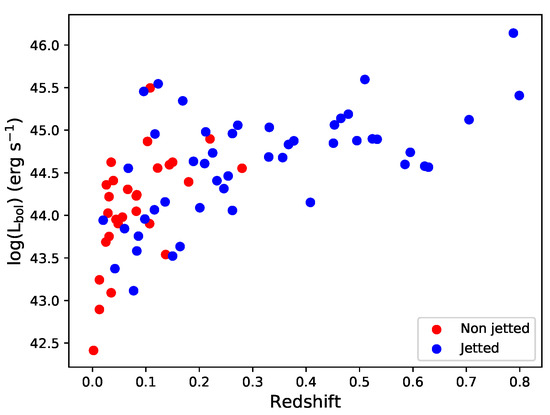The bolometric luminosity of our sources as a function of their redshift. Non-jetted objects are shown in red, while jetted sources are plotted in blue.