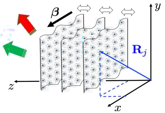 where is the static position of the jth atom (, is the oscillation amplitude, and is the oscillation frequency. A conceptual representation of the spatiotemporally modulated atoms is shown in Figure 1. For example, a traveling-wave modulation on the plane corresponds to with and being momentum “kicks” on the same plane. A spinning-wave modulation around an axis orthogonal to the mirror’s plane corresponds to , where ℓ is an integer denoting an imprinted angular momentum and is the azimuthal coordinate of each atom. Note that, under this modulation, the atoms are not rotating but the temporal dephasing of their oscillatory motion along the z direction is spinning around the axis. The traveling-wave modulation could be implemented by an acoustic perturbation that launches a plane-wave on the surface of the mirror. In the case of a meta-mirror formed by an atomic array monolayer trapped in a three-dimensional deep optical lattice, the modulation could be accomplished by shaking the vertical lattice and by using spatial light modulators to set a phase shift among the vertical trapping fields on different atoms to imprint the linear synthetic phase.