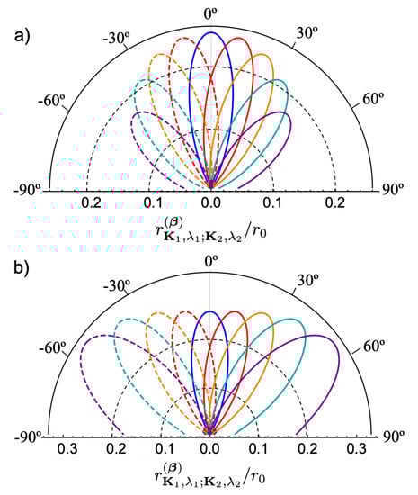 Two-photon angular emission. Emission lobes in the -plane of one of the DCE emitted photons with (a) TE and (b) TM polarization for various magnitudes of the momentum kick , namely, (blue), (red), (orange), (cyan), and (purple). Solid (dashed) curves correspond to positive (negative) values of . The other photon is assumed to be emitted along the z-direction, and we trace over its polarization degree of freedom. The parameters are , , , and . The emission rate is normalized to .