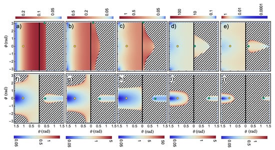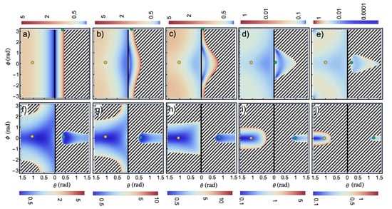 Density polar plots of emitted radiation in TE polarization. The function is plotted for various amplitudes of the momentum kick , varying from 0 to 0.9 in steps of 0.1 (a–j), respectively, for the infinite periodic monolayer. The angles and are the usual azimuthal and polar angles. The kick is along the in-plane () direction . Emission is independent of , i.e., emission towards and are identical. The areas to the right (left) of the central vertical solid line correspond to the emission of the high- (low-) frequency photon in a pair. Orange circles denote a given emission direction of the low-frequency photon, fixed in all panels to and . Green circles denote the correlated emission direction of the high-frequency photon, and . Shaded areas highlight regions of forbidden two-photon emission. The parameters are and .