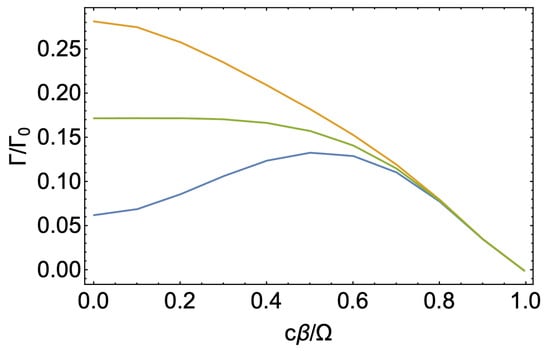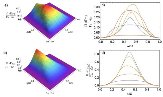 For , the integrals and are one of Lommel’s integrals and have a closed form, but the other three integrals do not. In the limit , all of the integrals are of the Weber–Schafheitlin form, , with exponent or . The above expressions allow us to calculate in space–time motion-induced DCE under spinning modulation. Direct inspection of shows that it satisfies the condition . This identity states the simple fact that, as photons are emitted in pairs satisfying energy and angular momentum conservation, the emission rate of a photon with given frequency and angular momentum must be the same as the emission rate at the complementary frequency and angular momentum. In [14], we studied the angular momentum spectrum for DCE photons emitted from a quantum metasurface with spinning modulation of its optical properties. We numerically found that the angular momentum spectrum for the high-frequency photon is symmetric and maximal around the driving angular momentum () and that the one for the low-frequency photon is symmetric and maximal around the complementary angular momentum (). The same properties are expected to occur for the case of space–time mechanical DCE.