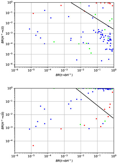 As can be immediately seen, the vast majority of the points found in Ref. [30] fail this check for (case , blue points) or for (cases and , red and green points). In addition, in some cases, when a point appears on both plots below the line, it corresponds to the second charged Higgs of the model lying close to the decay threshold. However, the first charged Higgs of the same model usually leads to large branching ratios; therefore, the model is ruled out.