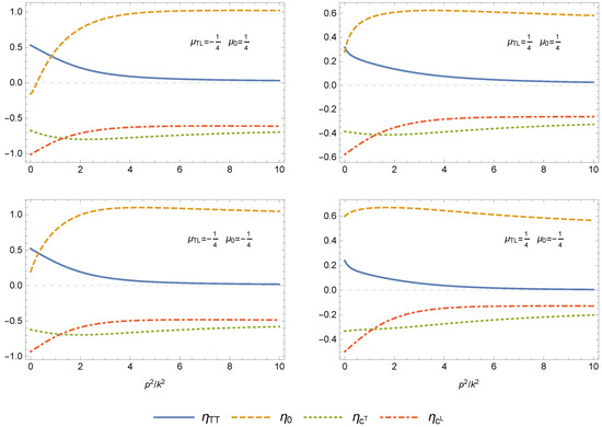 The introduction of the dimensionless quantities and according to (21) ensures that, in the Landau limit, the two propagating modes feature a standard propagator with mass parameters and , respectively. We emphasise that Equation (21) is only a rewriting of the two-point function, which conveniently allows us to introduce the individual gaps and .