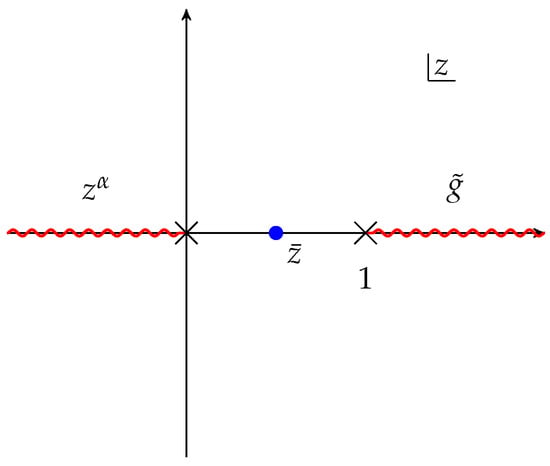 The conformal blocks Equation (17) have a branch cut for that originates from the non-integer powers of z. The blocks have another branch cut for originating from . The analytic structure of the conformal block is depicted in Figure 2. Note that the discontinuity of the branch cut due to the overall power in the second line of Equation (13) is much simpler, which results in: