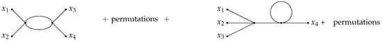 In this section, we discuss how the dispersion relation Equation (29) can be applied to compute the four-point correlation function in Wilson–Fisher theory in dimensions as a perturbative expansion in . The Wilson–Fisher theory is described by the Lagrangian: