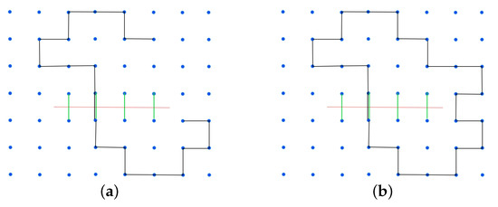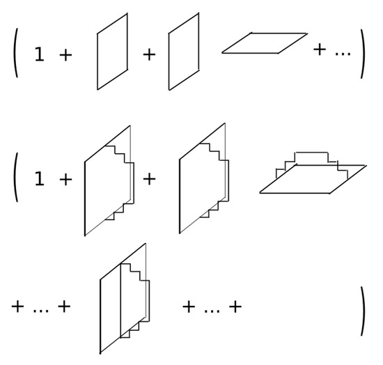 - In the expansion of the partition function, due to the measure , the terms that contribute contain products of the composite (or its conjugate) over links organized forming loops. Otherwise, the integrals over the site variables at the line edges vanish (see Figure 1);