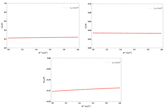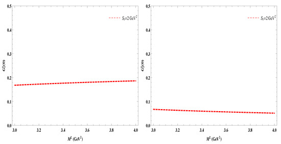 After calculating both sides of the correlation function, hadronic and QCD, at this point, we matched the coefficients of the chosen structures from both sides of Equations (12) and (13). To suppress the higher states’ contributions and continuum contributions, we applied Borel transformation over the variables