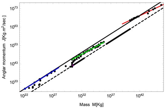 The angular momentum of various astronomical objects is shown [19,20,21]. They roughly scale as (black solid line) on the whole. According to this figure, astronomical objects are divided into three classes: dust(metal), gas(non-metal), and DM, from small to large scales. Each of them locally scales as where , respectively, represented as blue, green, and red lines.