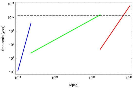Time scales estimated from Equations (6)–(10) for each class are shown as a function of the mass M of the astronomical object. The color blue, green, and red reflects each class and corresponds to the fitting color in Figure 1. The dashed line represents the age of the Universe at present for comparison. Although the structure formation will dominantly take place at the smallest scale in each class, there may take place some formation process at the intermediate scales in the steady flow of energy. The estimate in this figure should not be taken too seriously since the Universe is not steady, in particular at larger scales. Actually, the estimated time scale well exceeds the age of the Universe in those scales.