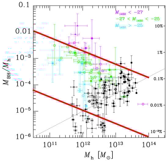 The mass ratio of SMBH and DH as a function of : observational data and our estimates. in the figure is the same as our . On top of the observational figure from [34] Figure 3b, our estimates Equation (39) (lower red line) and Equation (42) (upper red line) are plotted. objects are colored depending on (rest frame 1450A absolute magnitude: magenta, brighter than —27; green, —27 to —25; cyan, fainter than —25). Black symbols are data of local galaxies quoted from [35] in [34]: ellipticals •, classical bulges ∘, and pseudo bulges ×. A detailed explanation is in [34].