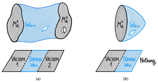 Two d-dimensional manifolds, and , are said to be cobordant if their union is the boundary of another -dimensional manifold, . From the point of view of a lower dimensional vacuum obtained from compactification of a theory on , the fact that it is cobordant to can be interpreted as a domain wall separating the original vacuum and the one obtained by compactifying the same theory in , as shown in Figure 1a. Furthermore, a manifold is in the trivial cobordism class if it is a boundary itself and compactifying a theory on such a manifold there exists a domain wall that acts as an end of the world membrane, separating the vacuum from nothing, as displayed in Figure 1b.