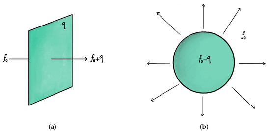 (a) Shift in a flux as a consequence of crossing a membrane with charge q under the dual 3-form. (b) Vacuum decay by nucleation of a bubble that expands and is surrounded by a membrane with charge q, such that the flux outside the bubble, , is reduced in the internal region of the bubble.
