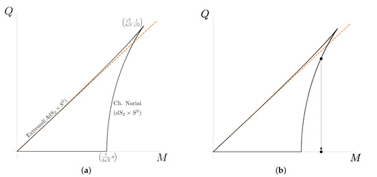 We are interested in the charged black hole solutions to this action, the so-called Reissner–Nordström–de Sitter black holes. These solutions generically have three horizons, the two that are the analogous to the Reissner–Nordström solution in flat space, plus the cosmological horizon of dS. Their phase space is shown in Figure 4a. The usual extremality bound, given by the coincidence between the first two horizons, corresponds to the upper line and solutions above it are superextremal. Additionally, there is an upper bound for the mass of a black hole for a given charge, which arises due to the fact that the black-hole horizon must remain within its own dS cosmological horizon. The limiting case, where both horizons coincide, corresponds to the so-called charged Nariai black holes, depicted as the curved line in the right of the figure. These solutions are a key difference in dS, and study of their decay in detail leads to the announced bound. Finally, the point where both the extremality line and the charged Nariai line meet is the so-called ultracold black hole, and it gives the highest values for the charge and the mass. The inside region thus contains all the possible subextremal charged black holes in dS.