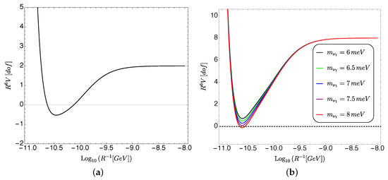 Figures taken from [98]. The vertical axis represents the 3d effective potential for the radion, (in units of with GeV), multiplied times so as to give a constant profile when , and it is normalized by the contribution of one degree of freedom (a) Radion effective potential for Majorana neutrinos (with heavy Majorana masses) where an AdS minimum always develops. (b) Radion effective potential for (pseudo-)Dirac neutrinos with different values for the lightest neutrino mass (in mili-electron volts). The formation of an AdS vacuum can be avoided if the neutrino masses are light enough.