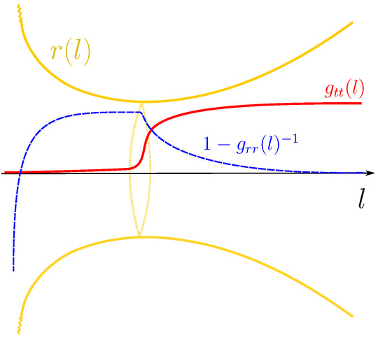 where are positive constants that depend on , and the neck radius , and is the value of the proper radial coordinate l at the neck. The parameter and the redshift constant at the neck depend on the Arnowitt–Deser–Misner mass, from which they can be obtained by solving (1) numerically starting from the asymptotically flat region. As the spacetime is integrated inwards, a cloud of negative mass, coming from the effective semiclassical fluid described by the RSET, gradually modifies the geometry until, just above the Schwarzschild radius of the geometry (corresponding to the asymptotic mass), the wormhole neck is reached.