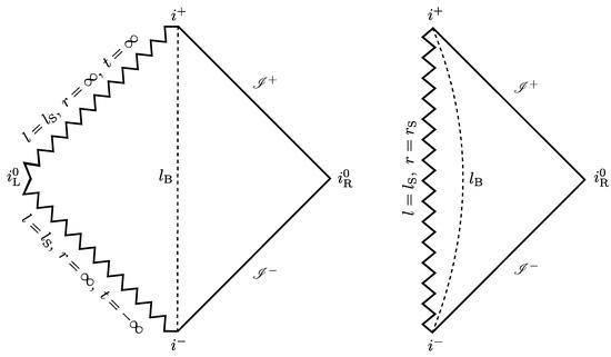Thus, essentially, semiclassical corrections in the Polyakov approximation push the future Schwarzschild horizon of classical GR (where the redshift function goes to zero) towards an internal and singular asymptotic region inside a wormhole. If one considers a more refined approximation to the RSET, such as the s-wave analysis in [23] (this approximation incorporates the effect of back-scattering of the modes in the s-wave sector), then the curvature singularity inside the wormhole appears before an asymptotic region is reached and before the redshift function goes to zero (the conformal diagram of this spacetime is represented in the right diagram in Figure 2). The self-consistent vacuum semiclassical solution develops a proper naked singularity. Thus, it appears that the “mass-without-mass” characteristic of Schwarzschild black holes is not preserved in semiclassical gravity.