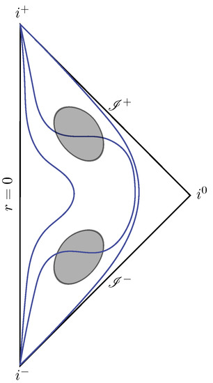 In this scenario, gravitational collapse is followed by an (approximately) time-symmetric bounce [41,42,43] (see Figure 5). There are two trapped regions: the bottom one is outer-trapped and the upper one inner-trapped. Again, any long-lived white horizon should be unstable, if for no other reason than just semiclassical consistency [30,44]. Assuming that the trapped regions are short lived, one must consider this bouncing geometry as just describing one cycle within a transient period consisting of oscillations between black-hole-like and white-hole-like configurations. After this transient period, dissipation would cause the system to search for a new (horizonless) state of static equilibrium. Much like in the previous case, the stabilisation of these configurations would be closely related to the energy content present in the Boulware vacuum. The new states of equilibrium should then be ultracompact stars with a surface slightly above the gravitational radius. Once again, in this scenario, the behaviour of matter is crucial for understanding both the transient regime and the static equilibrium states.