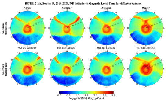 The presence of very high ROTEI values at high latitudes finds its explanation in the phenomena affecting the auroral oval. At high latitudes, ROTEI highest values draw a ring around the magnetic poles and are elongated towards lower latitudes in the nighttime sector. Indeed, auroral latitudes are characterized by particle precipitation causing the increase of Te in the topside ionosphere through Joule heating. A recent work by [31] investigated the seasonal behavior of the electrical conductivity parallel to the Earth’s magnetic field, by using only plasma data (Ne and Te) from Swarm A spacecraft. Although the parallel conductivity also shows a slight dependence on Ne, the main contributor to it remains Te (see Equation (6) in [31]). In their work, the authors of [31] estimated the contribution to conductivity from particle precipitation by subtracting from the overall conductivity that inferred from Ne and Te modeled by IRI [6]. They found a remarkable variability with season of the parallel conductivity (and, to a large extent, of Te), showing that the effect of precipitation increases the parallel conductivity (and Te) especially in the nightside and approaching the border of the auroral oval at ± 60° QD latitude, and in the region of the dayside cusp, and this effect is stronger in winter than in summer and at equinoxes.