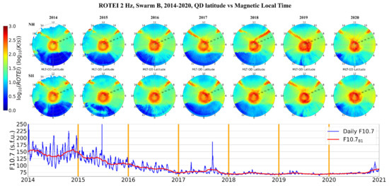 In Figure 3, ROTEI mean values are represented in polar projection (MLT vs. QD latitude), for the NH (first row plots) and the SH (second row plots), from 2014 to 2020 (from left to right). To highlight the variation of solar activity, the third row plot represents the daily F10.7 solar index time series [42] and the corresponding 81 day running mean (F10.781), which best represents the long-term solar activity variation. As highlighted by F10.781 values, the year 2014 encompasses the maximum of the last solar cycle, the years 2015–2017 the descending part of the solar cycle, and the years 2018–2020 the quite-long-lasting solar minimum.