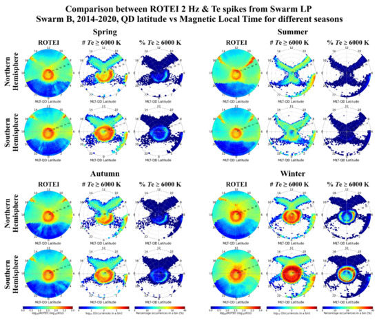 We tried to correlate the distribution and magnitude of ROTEI with the occurrence of spikes in the Swarm B Te dataset. We consider as spikes those Te observations greater than 6000 K. To properly compare ROTEI and Te spikes, from the Swarm B dataset (see Section 2.1) we selected all the observations for which Te ≥ 6000 K and then binned them like we did for ROTEI (see Section 3.1) to reveal their spatial, diurnal, and seasonal occurrence. In Figure 4, to facilitate the visual comparison between the distribution and magnitude of both ROTEI and Te spikes, ROTEI mean values (the same as Figure 2), the number of occurrences of Te spikes in the bin, and Te spikes percentage occurrence in the bin are shown side-by-side as polar plots in MLT vs. QD latitude, for the four seasons and for both hemispheres. Te spike percentage occurrences in the bin are calculated by normalizing the number of Te spikes in the bin to the total number of Te observations in the same bin.