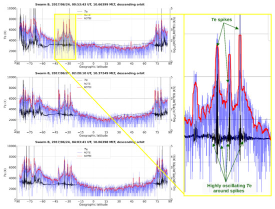 The presence of very high ROTEI values at mid and low latitudes for the MLT sectors around 9:00 and 15:00 is hard to explain. In fact, for these MLTs and locations, Te in the topside ionosphere does not exhibit any specific large-scale feature that could be readily connected with these very high ROTEI values. Moreover, we have to consider that in Figure 2 we represented the mean ROTEI values in the bin; as a consequence, these extremely high ROTEI values are not sporadic but represent the bulk of the data for the interested bins. This is why, in Section 4, we look for a possible correlation between high ROTEI values and spikes in the Te values recorded by Swarm LPs, whose presence is known to the Swarm community.