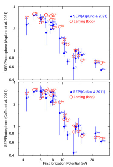 In the current theory by Laming, the low-FIP (<10 eV) elements which are ionized in the photosphere are subject to ponderomotive force of Alfvén waves, while the neutral high-FIP elements are not [9]. The forces differ for closed magnetic loops, near active regions, where the Alfvén waves can resonate with the loop length. Differences in the FIP pattern between SEPs and the solar wind are seen [10,11], and have been explained theoretically by closed and open field lines [9,12]. The two different photospheric abundance sets depend upon the choice of spectral lines used for the measurement.