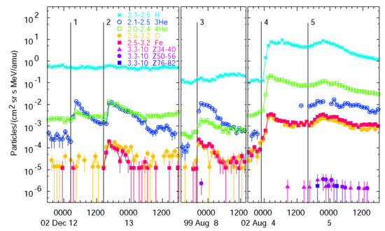 A sample of 3He-rich events of increasing intensity is shown in Figure 2. 3He equals or exceeds 4He in the first three events, but is smaller (or unmeasurable) in the larger events. 3He is found to be limited, as if all the 3He in the acceleration volume is depleted in large events [27,28]. Except in the smallest event where it is unmeasured, we find that Fe/O ≈ 1, vs. 0.131 ± 0.006 in the reference gradual SEP abundances. When the intensities become large enough, heavy elements begin to appear. See the review by Mason [29] for more information.