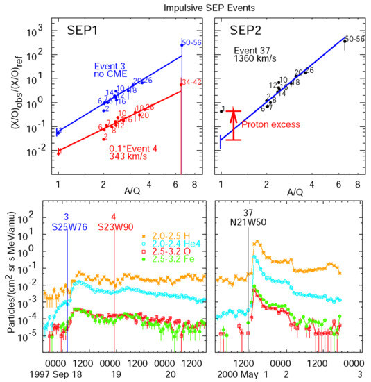 The lower panels show time histories of H, 4He, O and Fe, at the indicated MeV amu−1, for three impulsive SEP events, two small SEP1 events on the left and a larger SEP2 event on the right. Event numbers shown above source coordinates refer to the event list [26]. Power-law fits to the abundance enhancements, noted by Z, in each event, are shown in the upper panels and CME speeds are listed when CMEs are seen. The right-hand Event 37 is an SEP2 class event because of its large proton excess noted. For the SEP1 events on the left, the protons abundances lie on the extrapolated power-law fits [82,83].