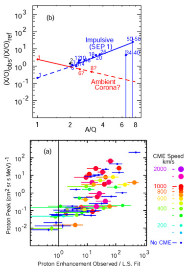 Panel (a) shows the peak proton intensity at 2–2.5 MeV vs. the proton excess relative to the Z > 2 power-law fit for 90 impulsive SEP events with the symbol size and color determined by CME speed as shown. Panel (b) suggests two possible contributions, impulsive SEP1 seed particles (blue) and ambient coronal seed particles (red), to the plot of enhancement vs. A/Q for the shock-enhanced SEP2 impulsive events [82,83].